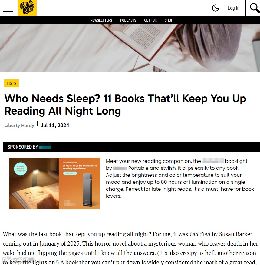 Themed post 与小说书单为同一内容,其中阅读灯的推广内容发生了变化。文章中将带有折扣码的图片替换成了阅读灯的详细介绍,内容更丰富,图片同样附带超链接,点击即可打开亚马逊详情页。