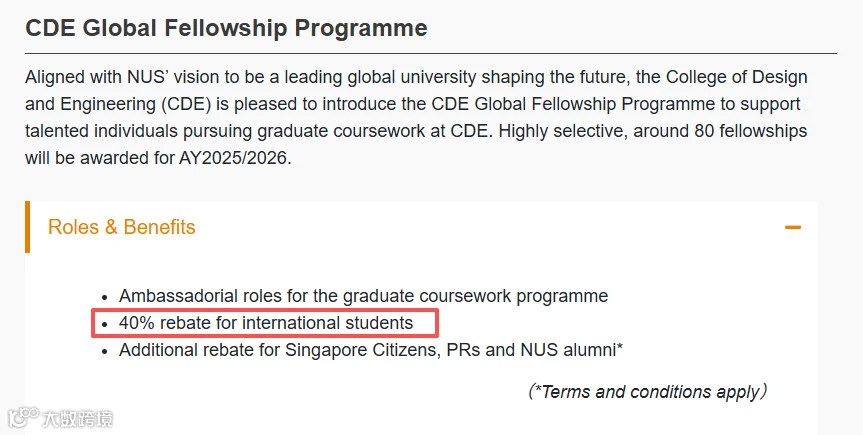 留学生可申请的费用补贴大概有两部分,分别是奖学金和国奖。新国立设计与工程学院给研究生提供全球奖学金,2025/2026学年有大约80个奖学金名额,申请成功的国际生可以获得40%的学费减免。