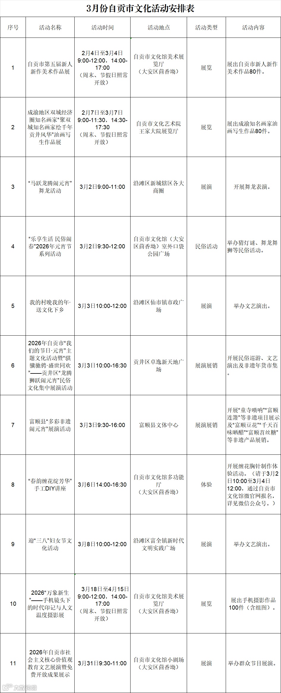 《3月自贡市文化活动安排表》已出炉,全市各区县的精彩活动一网打尽。展览、演出、讲座、体验……总有一款适合您。