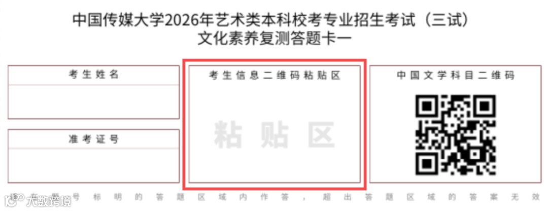 二、文化素养复测考试开始前,将为每位考生发放答题卡以及考生信息二维码(自带背胶)。考生领到答题卡后,须在规定的时间内,在答题卡指定位置准确清楚地填写本人姓名、校考准考证号等信息。对于考生信息二维码,考生须仔细核对二维码上的姓名、校考准考证号信息无误后,小心撕去背胶,将其粘贴在每张答题卡“考生信息二维码粘贴区”内,贴正压紧粘牢,位置如图中红框所示: