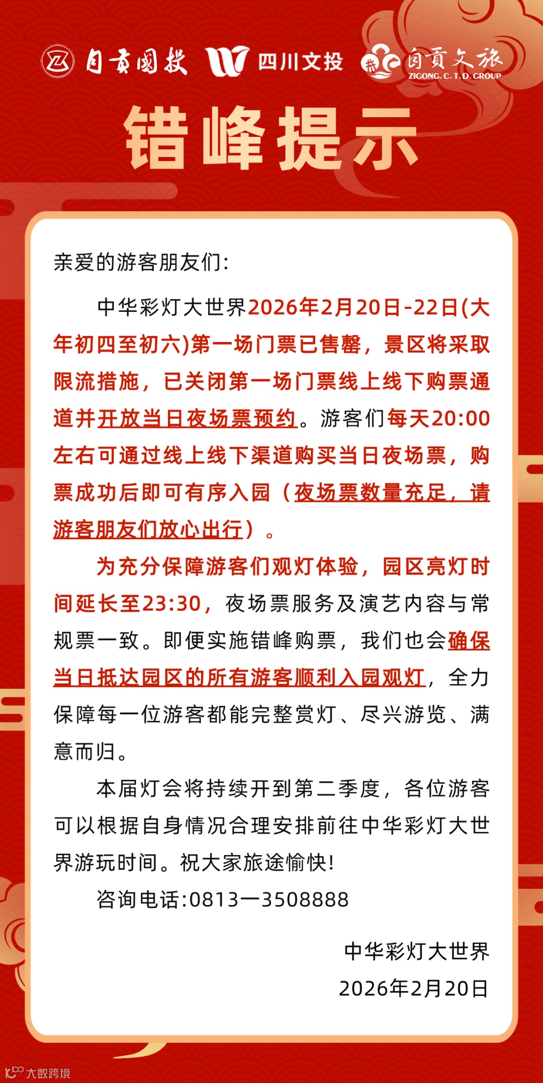 中华彩灯大世界2026年2月20日-22日(大年初四至初六)错峰提示