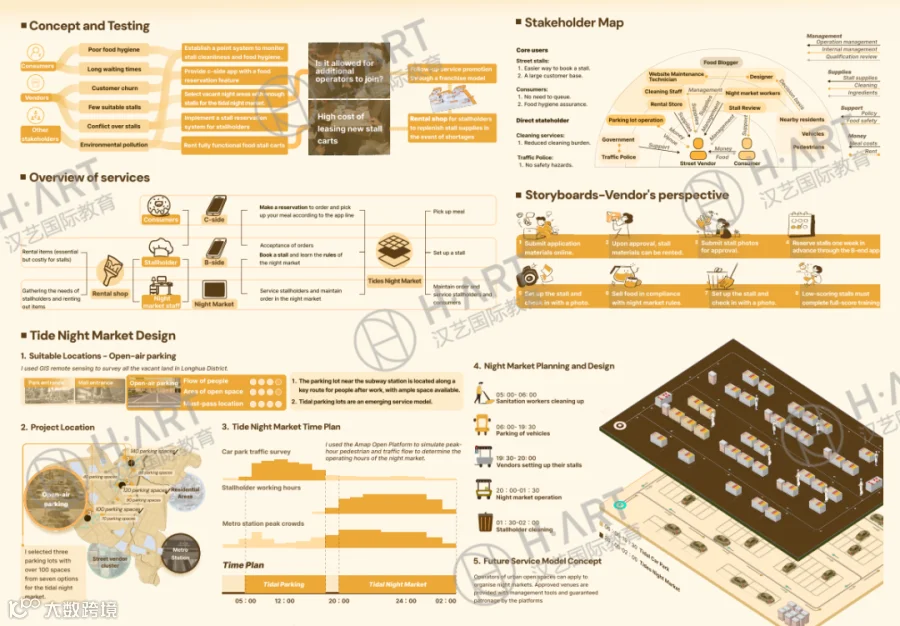 例如汉艺学员L同学在做服务设计项目时,针对夜市小摊管理进行设计,其中设计师需同时满足: