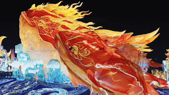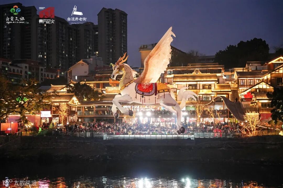 旋转跑马灯流光溢彩,28米巨型飞龙马凌空展翅,气势如虹。