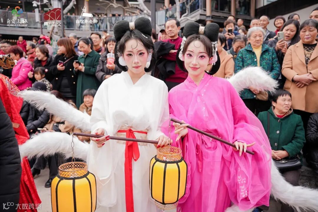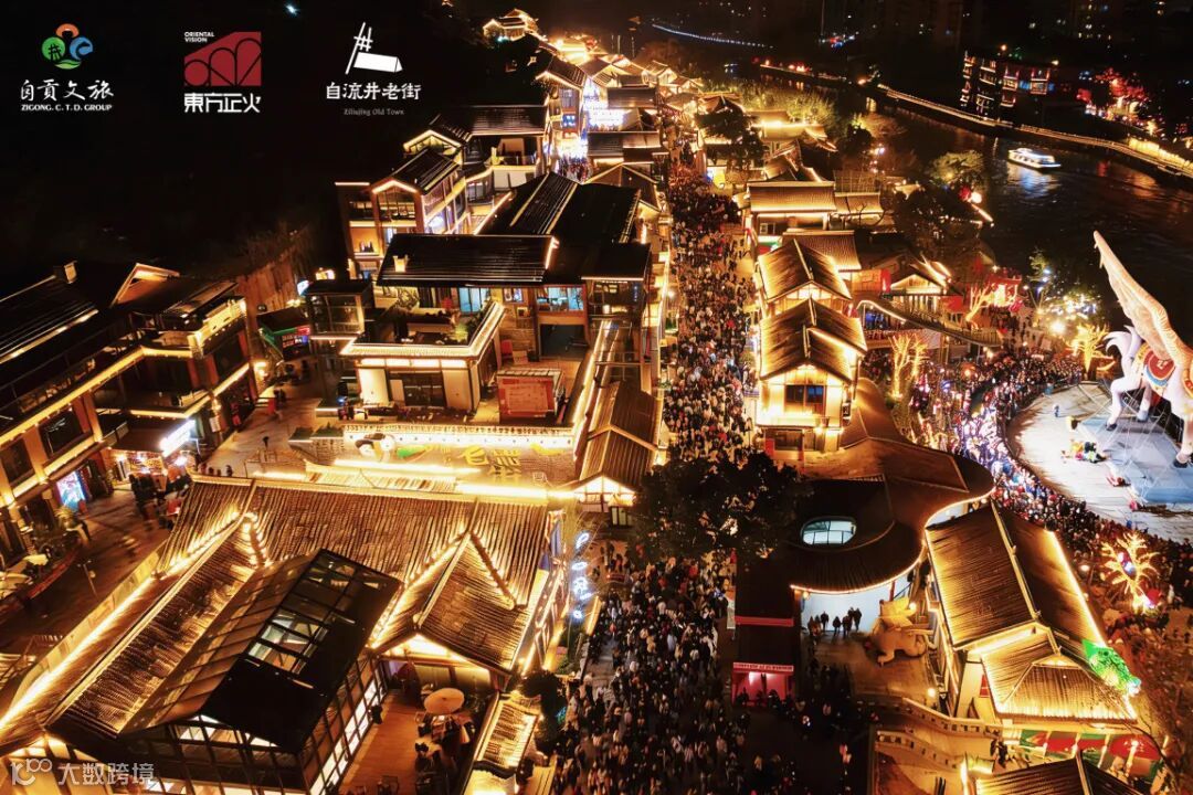 春节期间,自贡灯会600架特技无人机编队在夜空中变幻造型,大型特技特效无人机演出与主舞台节目轮番登场,国潮表演点燃全场氛围。