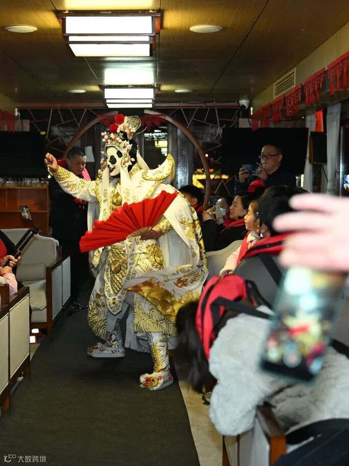 夜游釜溪精彩不断!船舱内小丑魔术秀逗趣互动,川剧变脸瞬息万变,曲艺演艺韵味悠长,在桨声灯影里感受别样年味。