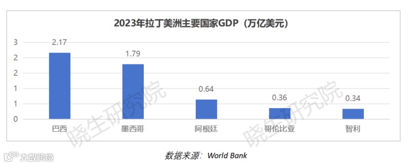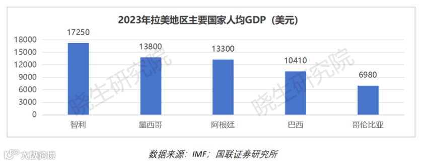 2023年,拉丁美洲总GDP约为6.3万亿美元,巴西贡献最大,约2.17万亿美元,占超过三分之一。其他主要经济体包括墨西哥(1.79万亿美元)和阿根廷(0.64万亿美元)。在人均GDP方面,智利、墨西哥、阿根廷、巴西和哥伦比亚分别为17250、13800、13300、10410和6980美元,除哥伦比亚外,其他四国均为中高等收入国家,消费市场需求潜力大。