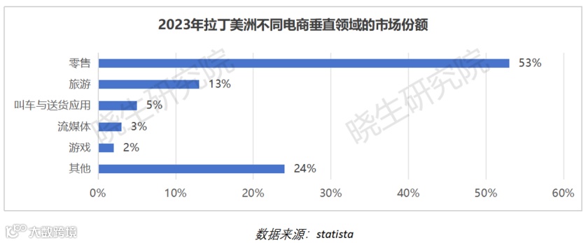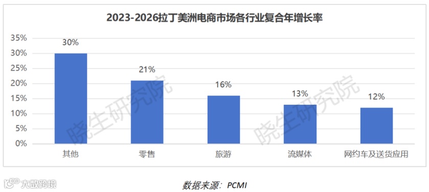 目前,零售贸易是拉丁美洲电商的主要行业,2023年市场份额达53%,增速最快。支付行业(包括税收、教育和账单支付等)也在快速增长,预计未来几年将增长30%。