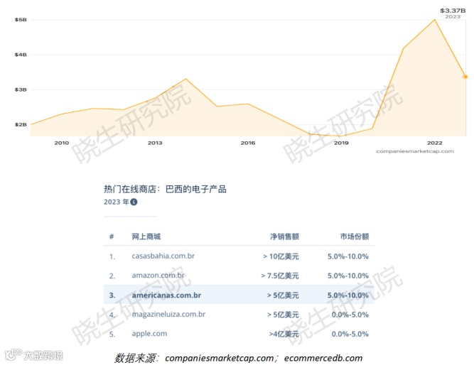Americanas.com是巴西的一家综合性在线商店,销售电子产品、爱好与休闲及DIY等多种商品。2023年总收入为33.6亿美元,净销售额约20.43亿美元,全球电商净销售额排名第86位。在电子产品领域,其市场份额位居巴西前三。