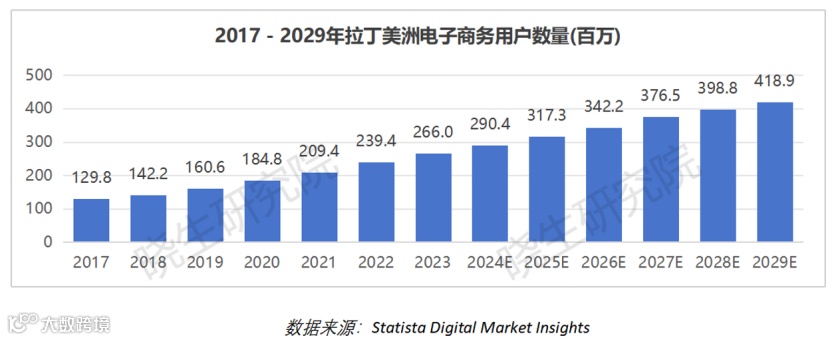 从2017年到2023年,拉丁美洲电商用户数量增长104.93%,预计到2029年将达到约4.189亿用户。