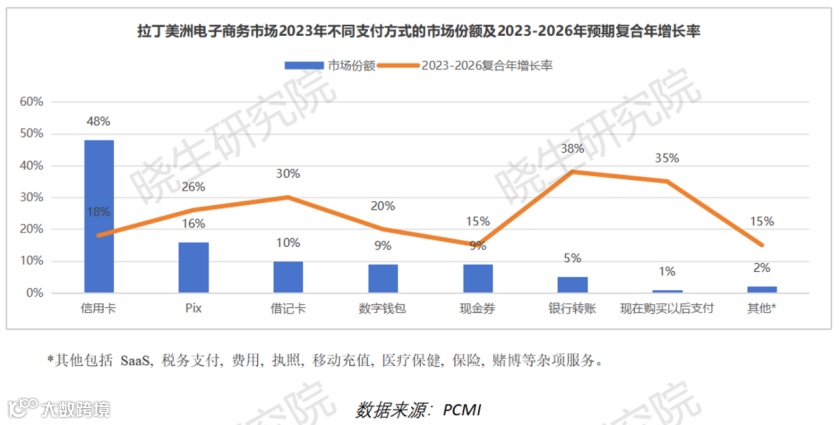 拉丁美洲多个国家正在推动数字商务政策,改善宽带连接和数字素养,以促进电商发展。政府还支持数字支付系统,特别是巴西中央银行开发的实时支付网络Pix,2023年已占据拉丁美洲电商交易量的16%。越来越多的企业使用Pix进行收付款,借记卡交易量较低,而Pix交易量则增加。如今,约70%的巴西企业接受这种支付方式。