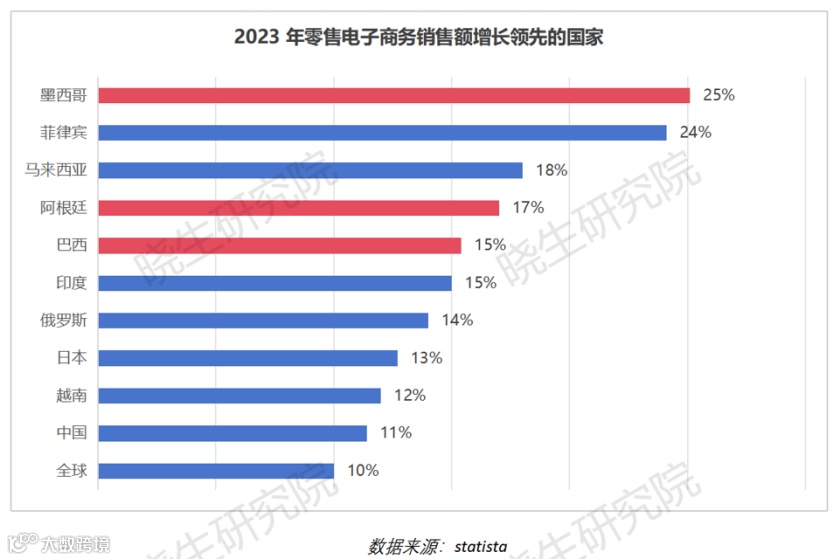 2023年,墨西哥、阿根廷和巴西的电商销售额增长率分别为25%、17%和15%,均高于全球平均水平。墨西哥排名全球第一,拉美地区电商正处于高速发展阶段。