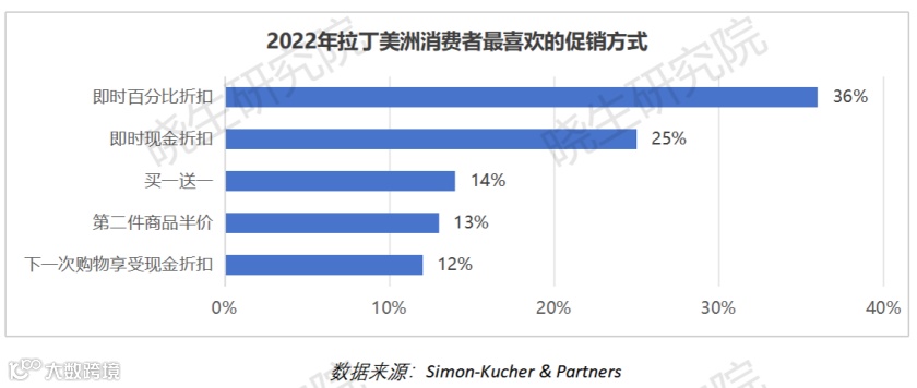 2022年,拉丁美洲消费者最偏好的促销机制是“即时百分比折扣”和“即时现金折扣”,共获得61%的喜爱。其他受欢迎的促销方式包括“买一送一”(14%)、“第二件商品半价”(13%)和“下一次购物享受现金折扣”(12%)。这表明消费者更倾向于直接的价格优惠。