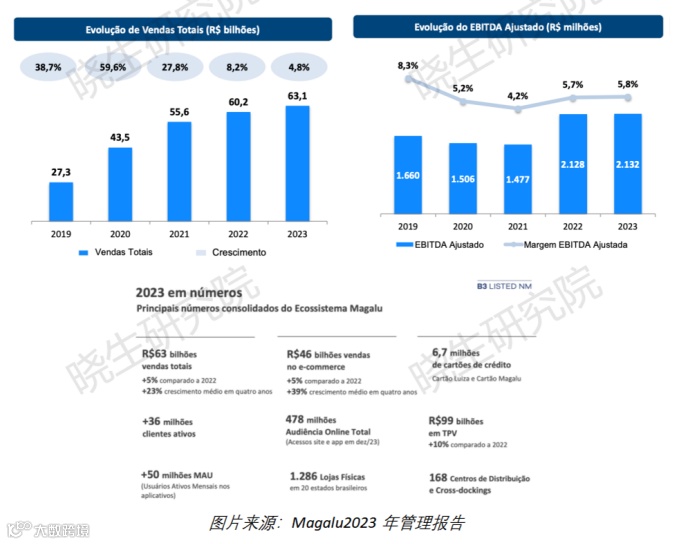 2023年,Magalu的总销售额(线上和线下)达到630亿雷亚尔,同比增加5%。其中,实体店销售额为170亿雷亚尔,在线销售额为460亿雷亚尔。EBITDA利润率为5.8%,为2020年以来的最高水平。第四季度实现净利润1.02亿雷亚尔,全年现金流生成达15亿雷亚尔。此外,公司在年底总现金储备91亿雷亚尔,净现金储备17亿雷亚尔,并通过定向增发筹集了12.5亿雷亚尔,主要用于技术投资和优化资本结构,以支持公司的长期发展。