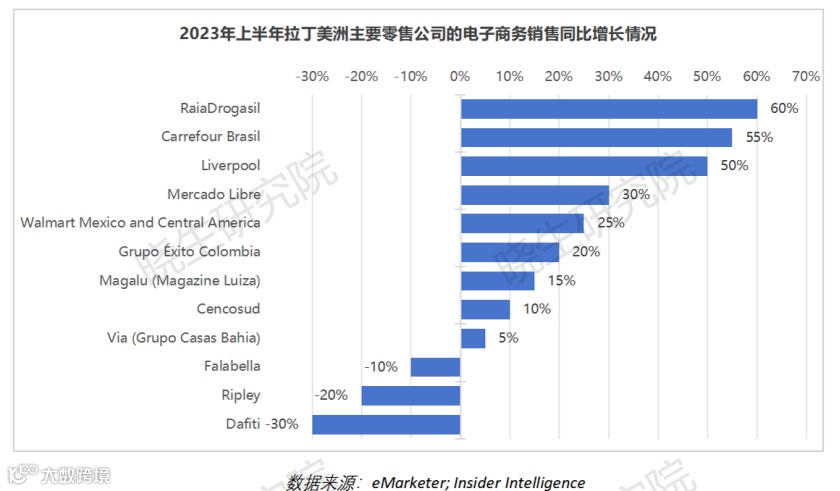 拉丁美洲的零售电商市场竞争激烈且分化明显,市场仍有增长潜力。2023年上半年,拉美部分公司如RaiaDrogasil、Carrefour Brasil和Liverpool正在快速扩张并赢得市场份额,而Dafiti、Ripley和Falabella等公司则面临挑战,需要重新评估和调整其市场策略。