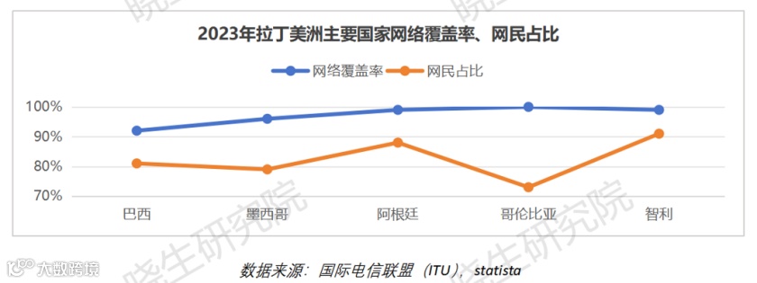 拉丁美洲五个主要国家几乎实现网络全覆盖,网民占比均在70%以上,智利达到91%,这推动了当地电商发展。2022年,拉美电商渗透率为11%,墨西哥最高,达到13%,巴西和智利的渗透水平相同。