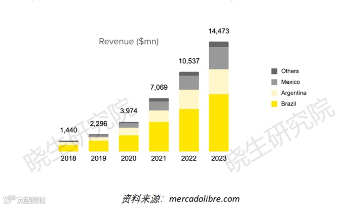 2016年至2023年,Mercado Libre在拉丁美洲电商市场显著增长,商品交易总额(GMV)从8亿美元增至45亿美元,年增长率为29.9%,复合年增长率(CAGR)达28%。平台买家数量增加16.4%至8500万,售出商品数量增长22.4%至14亿件,配送商品数量增长45%至6.5亿件。2023年,Mercado的总收入为1447亿美元,近50%来自巴西市场,相较于2018年的144亿美元,收入增长了10倍。