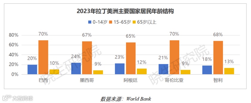 2023年,拉丁美洲总人口约为6.65亿人,其中南美洲约4.4亿,中美洲约1.8亿。与东亚、欧美等地区相比,拉美地区人口年龄中位数较低,年轻人口比例高,仍具有人口红利优势。