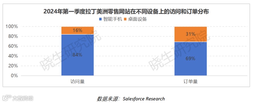 2024年第一季度,拉丁美洲零售网站访问中,智能手机占84%,桌面占16%;订单比例方面,智能手机占69%,桌面占31%。智能手机在在线零售活动中占主导地位。