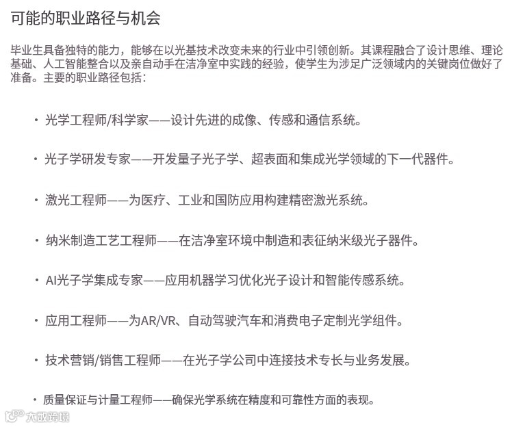 亮点之一,它是和光学结合的设计专业,听起来感觉和设计不沾边,但像AR/VR眼镜就是交互设计和纳米光学天线的应用哦,让人通过光与虚拟物体自然互动,根据光学类专业报道,未来光学技术在汽车、低空经济、教育领域皆有发展。