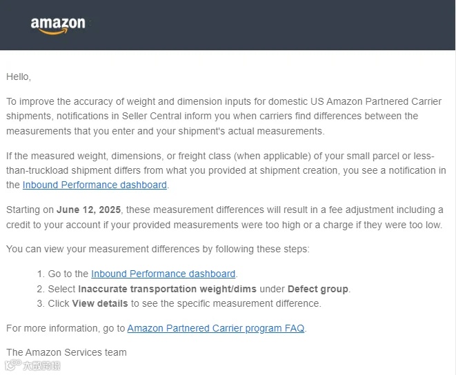2025年6月12日起,亚马逊将正式实施一项针对FBA入库运输的运费调整机制。根据官方公告,当合作承运商测量包裹的实际重量、尺寸或货运等级与卖家申报数据不符时,系统将自动触发“多退少补”费用纠偏: