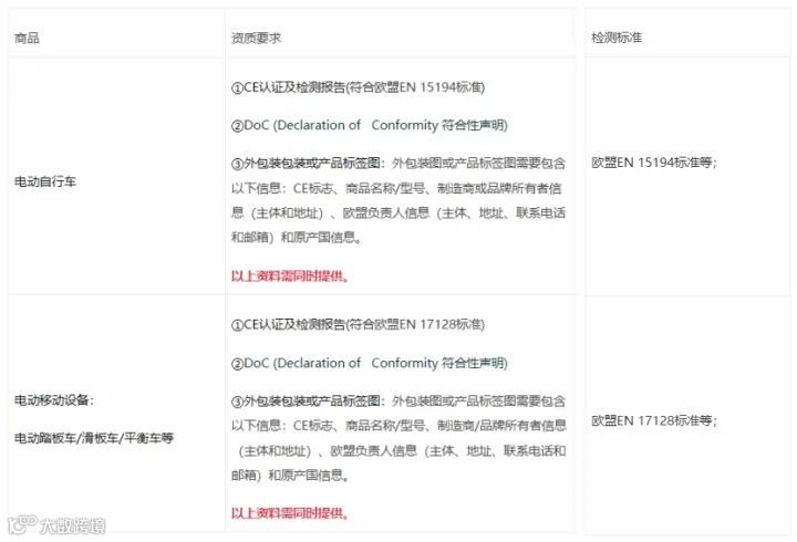 欧盟法规要求所有投放到欧盟市场的个人微型电动移动产品(Micromobility Products)应经过检测(符合EN 15194标准、EN 17128等欧盟标准),并获得符合标准的CE认证以及产品加贴CE标志,否则将面临商品不合规引致的执法风险。