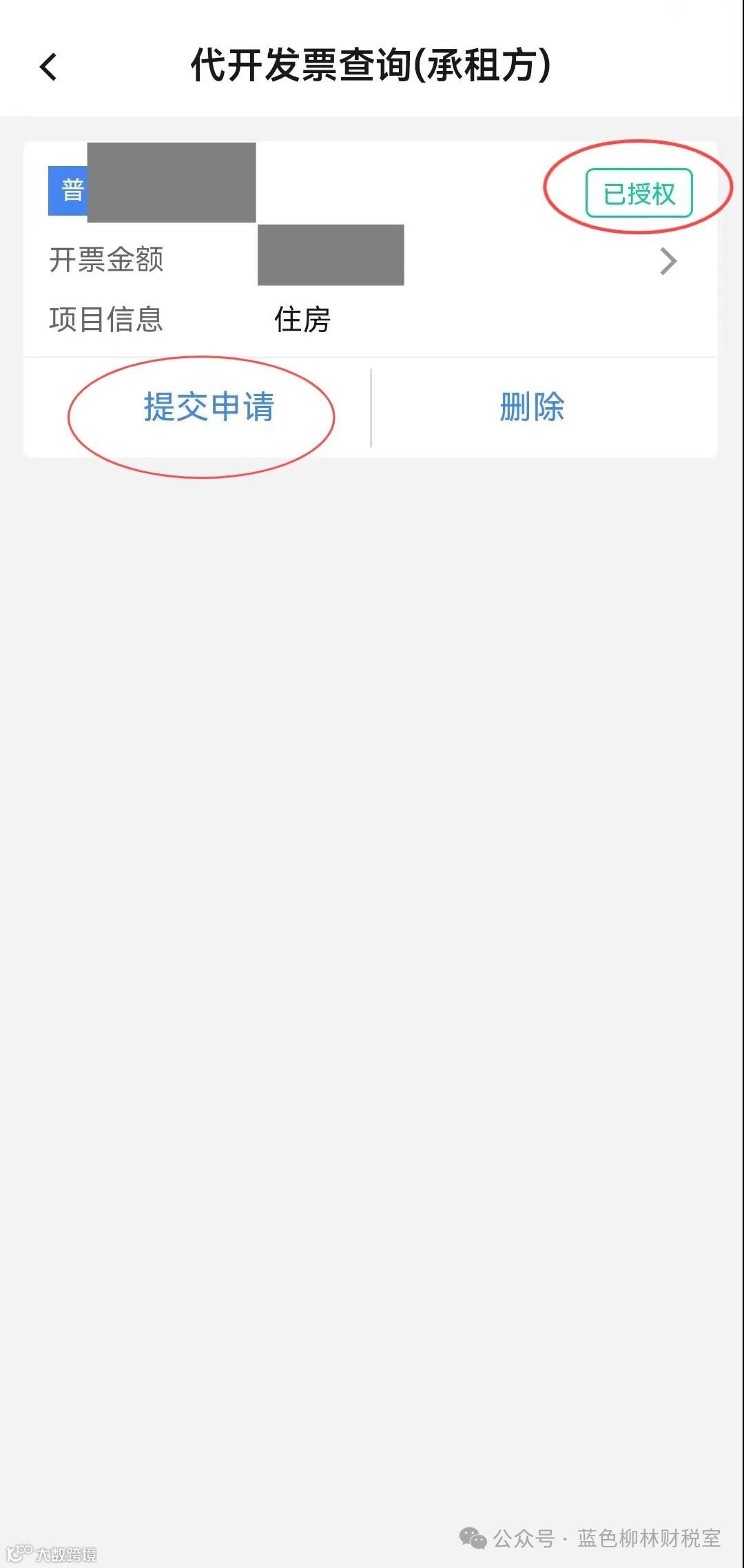 2.找到已提交的代开发票申请信息,右上角的状态变为【已授权】,点击【提交申请】。