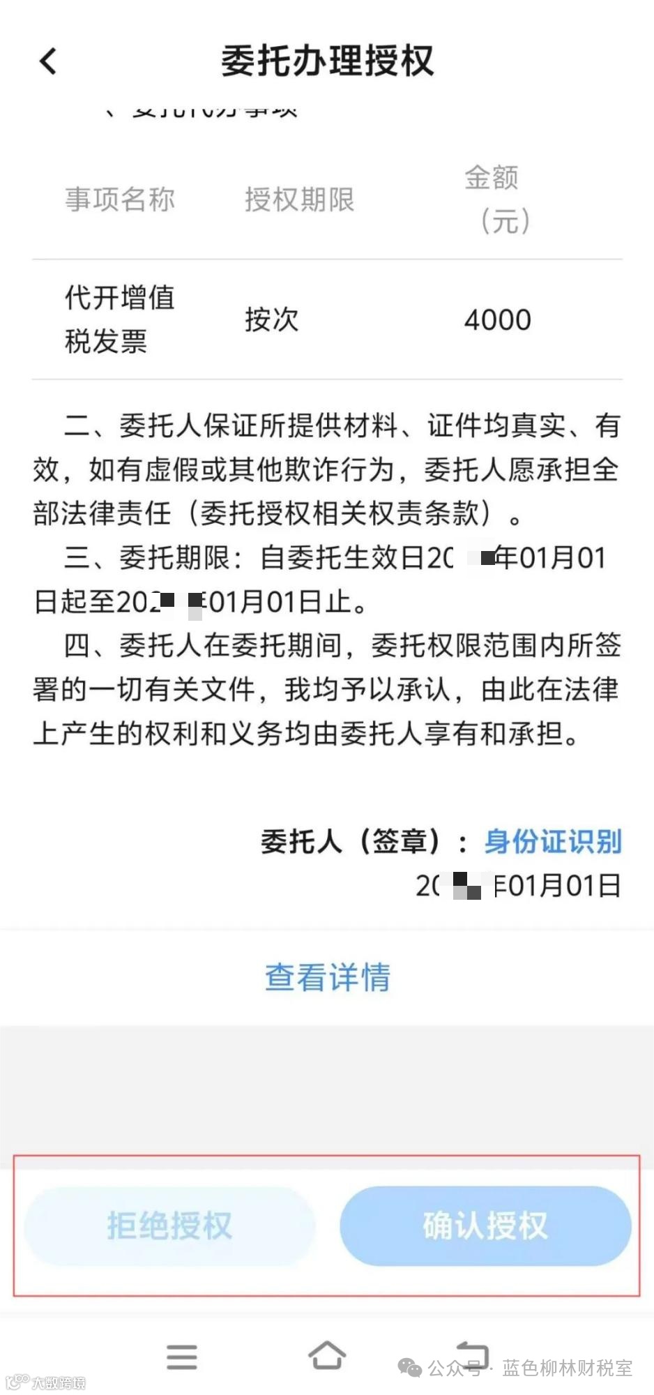 1.出租方在手机上打开电子税务局App,点击首页右上角的扫码按钮,扫描该二维码,进入授权委托书界面。点击【查看详情】按钮,可以查看【授权信息】和【委托办理事项】,确认无误后点击下方的【确认】可以回到【委托办理授权】页面。此时需先点击【身份证识别】进行人脸验证。完成人脸验证后,点击【确认授权】或【拒绝授权】来完成【委托办理授权】的操作。