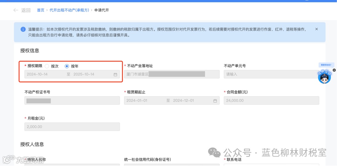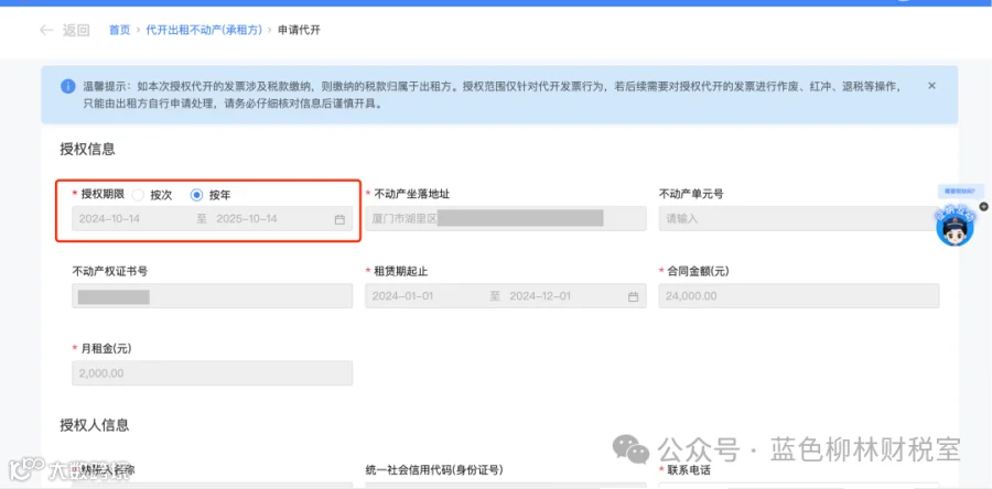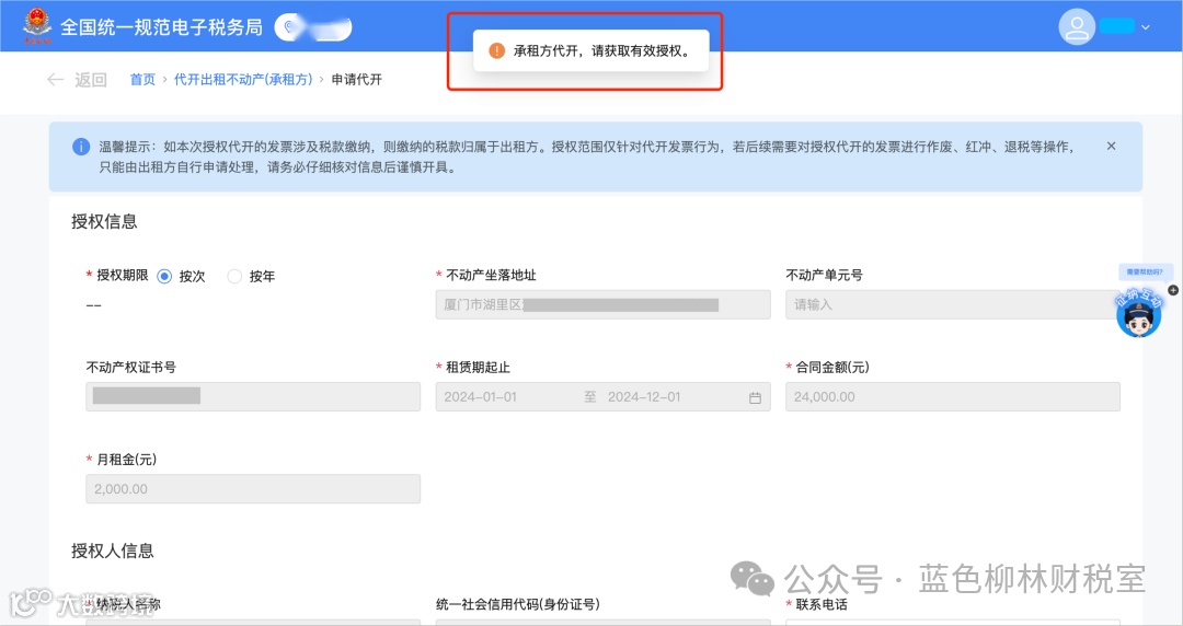 1.提交申请后,会自动跳转到授权信息填写页面,并弹窗提示:【承租方代开,请获取有效授权。】