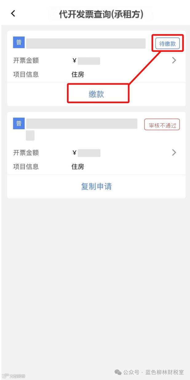 2.可以看到代开申请对应的状态变为【待缴款】,点击【缴款】。