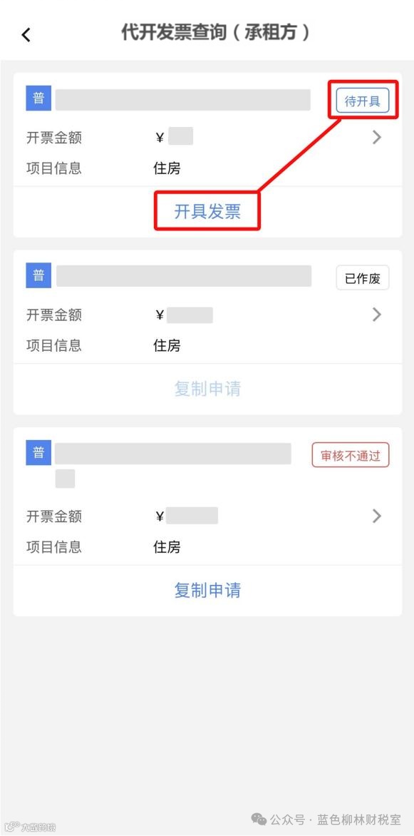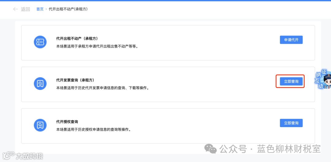 1.出租方完成授权后,承租方回到【代开发票查询(承租方)】功能页面,点击【代开发票查询(承租方)】对应的【立即查询】。