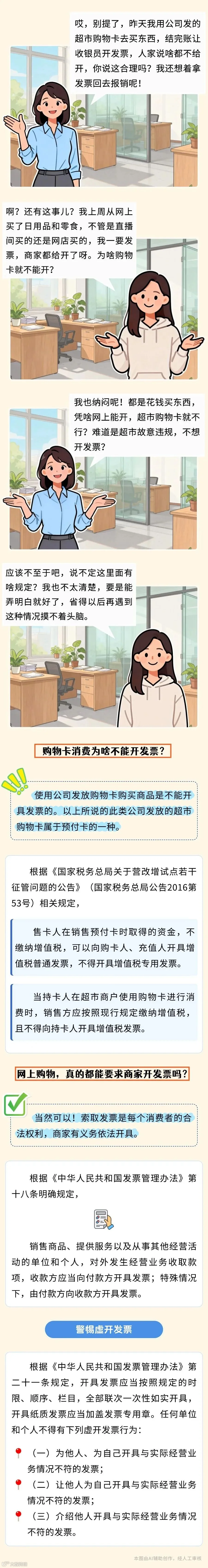 公司给我发了一张超市购物卡,我去超市买东西,收银员说不能再开发票,这符合规定吗? e财税生态圈