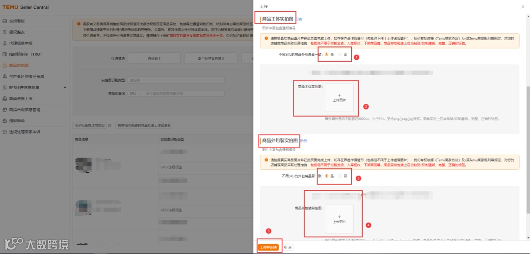 合规中心-商品实拍图-依次上传【商品主体实拍图】以及【商品包装实拍图】