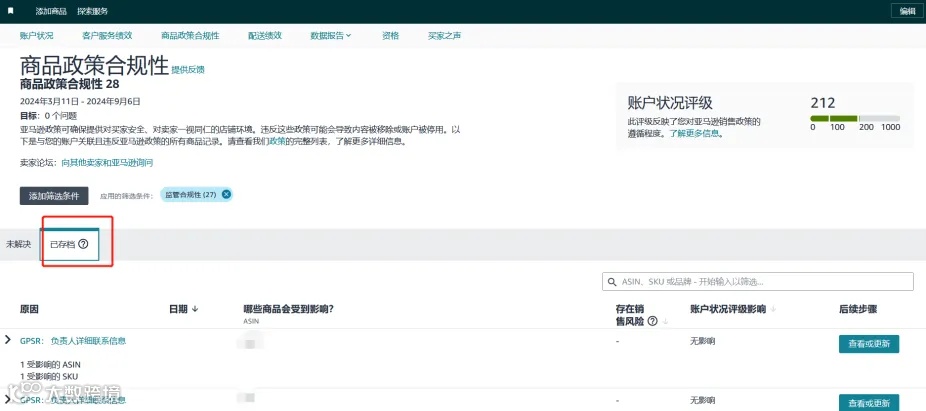 如果您的品牌或ASIN已移至监管合规性页面中的“已存档”子页面(如下图),或移至管理您的合规性页面中的“已完成”子页面,则视为合规。