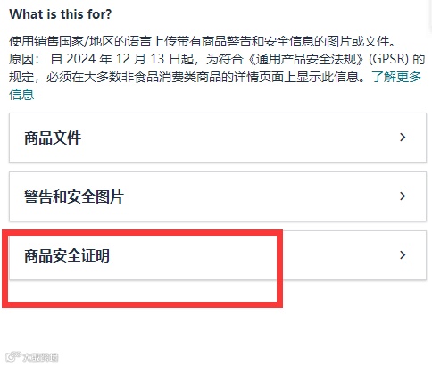 注意,不是所有的ASIN都有该选项。当您的ASIN没有“商品安全证明”的选项时,意味着您必须为该ASIN上传商品文件或警告和安全图片来满足GPSR的要求。
