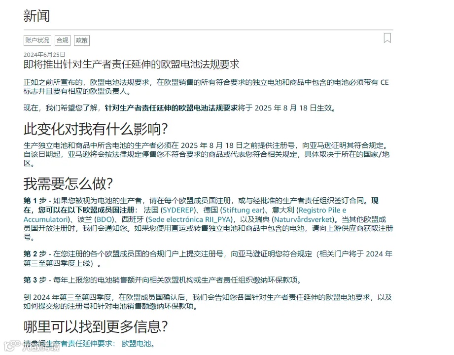 近日,亚马逊针对即将实施的欧盟EPR电池法再次发出合规通知。欧盟针对电池法规的生产者责任延伸要求将于2025年8月18日生效。卖家需在被视为生产者的每个欧盟国家/地区进行注册并向亚马逊提供注册号。