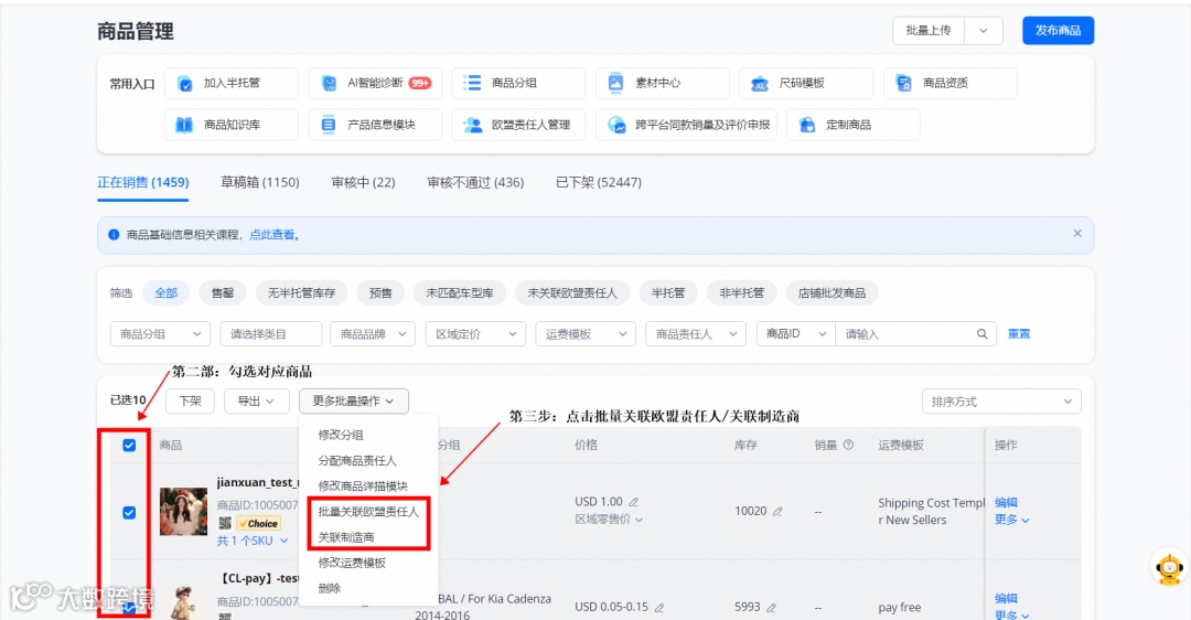 全托管商家:商品管理-商品列表-批量关联欧盟责任人