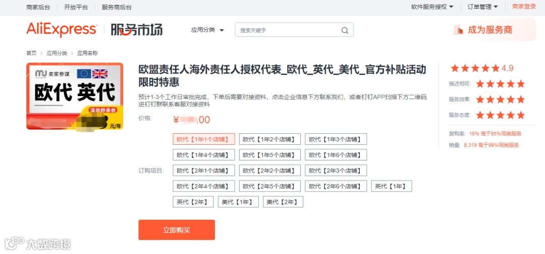 商家应为您销售的商品办理欧盟负责人,可在服务市场选择TOP服务商[跨境卖家参谋]为您省心省事快速完成办理。然后将信息上传后台。
