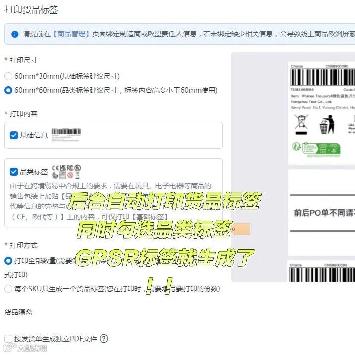将商品绑定的欧盟责任人、制造商信息、警告信息以及其他合规信息打印在商品标签上,完成实物商品贴标。