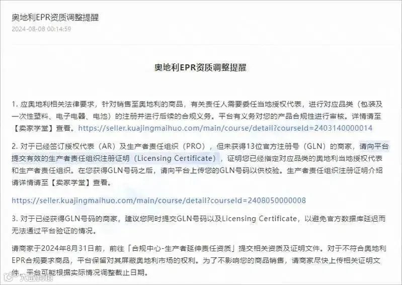 近期,TEMU发出奥地利EPR资质调整的提醒,要求卖家于2024年8月31日前,前往「合规中心-生产者延伸责任资质」提交相关资质及证明文件。否则平台将对不合规商品屏蔽奥地利市场。
