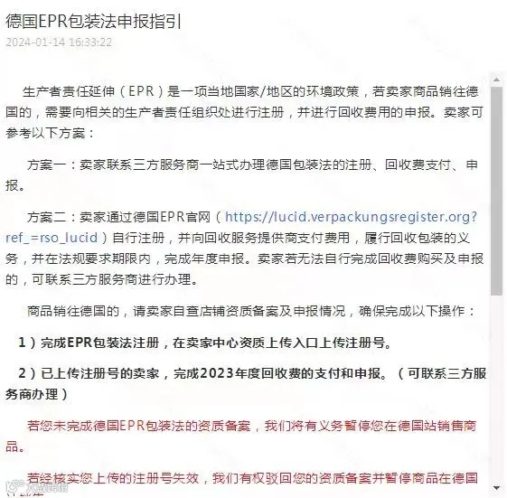 在德国市场,EPR体现为需要注册WEEE、电池法和包装法,分别用于电子设备、电池或带电池产品以及各类产品包装的回收。目前TEMU严格要求卖家注册德国包装法,否则将影响店铺提现功能或商品下架。