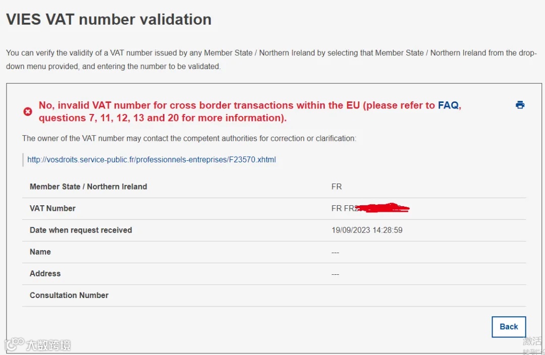 Step3:如果显现“Yes,valid VAT number”绿色字体,并显示税号的基本信息,则表示该税号有效。