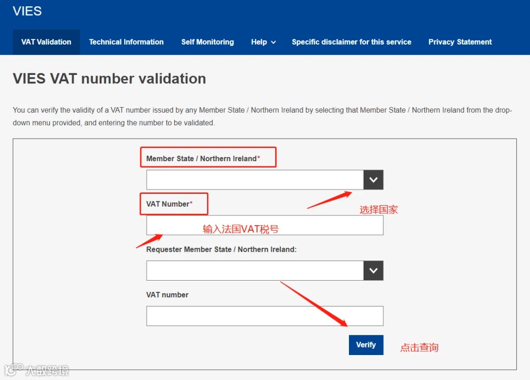 Step1:进入欧盟VAT查询官网后,按照图示操作输入法国税号: