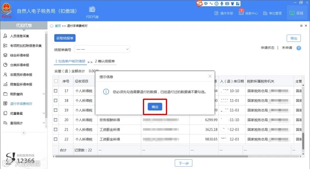 第二步:登录扣缴端后,在“代扣代缴”界面,点击左侧菜单“退付手续费核对”