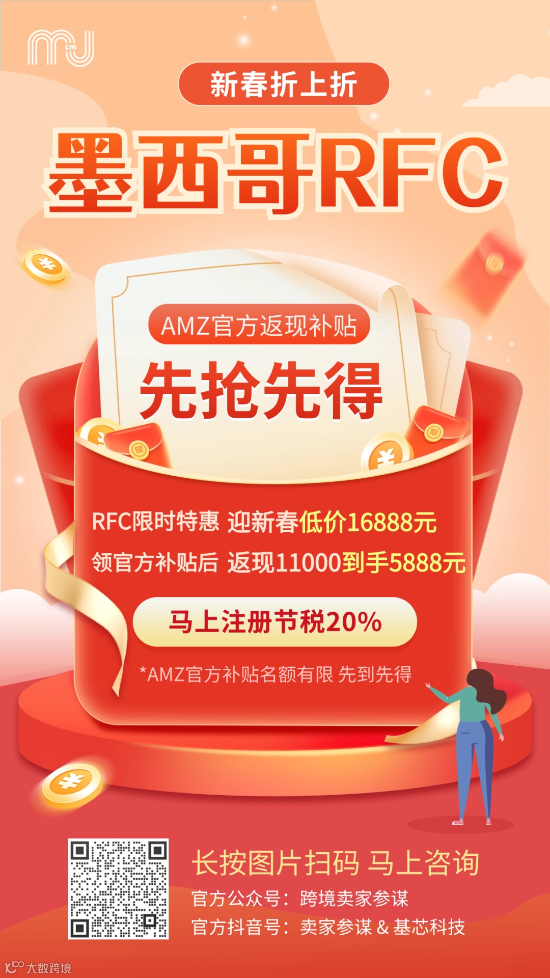 收到邮件有补贴资格的卖家,通过AMZ官方指定补贴商—跨境卖家参谋办理,墨西哥RFC限时特价5888元,立省11100元!