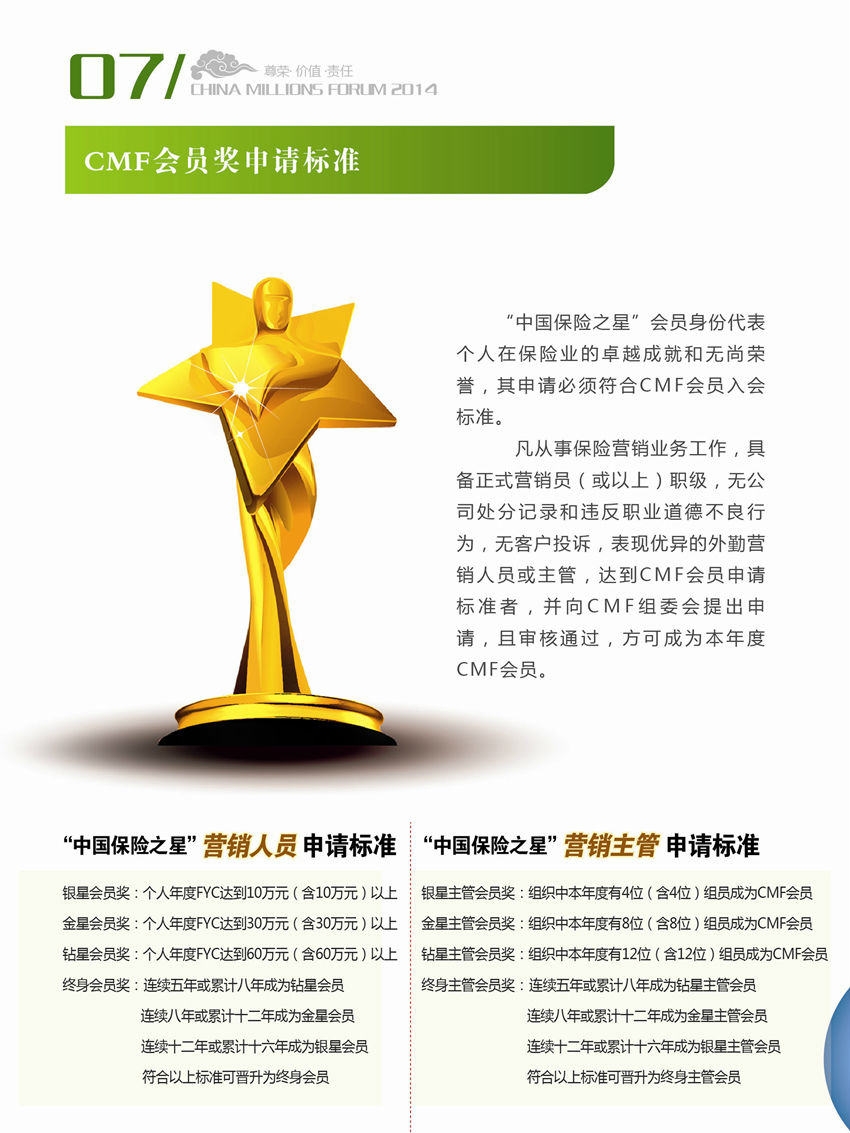 “中国保险之星”会员身份代表个人在保险业的卓越成就和无尚荣誉,其申请必须符合CMF会员入会标准。
