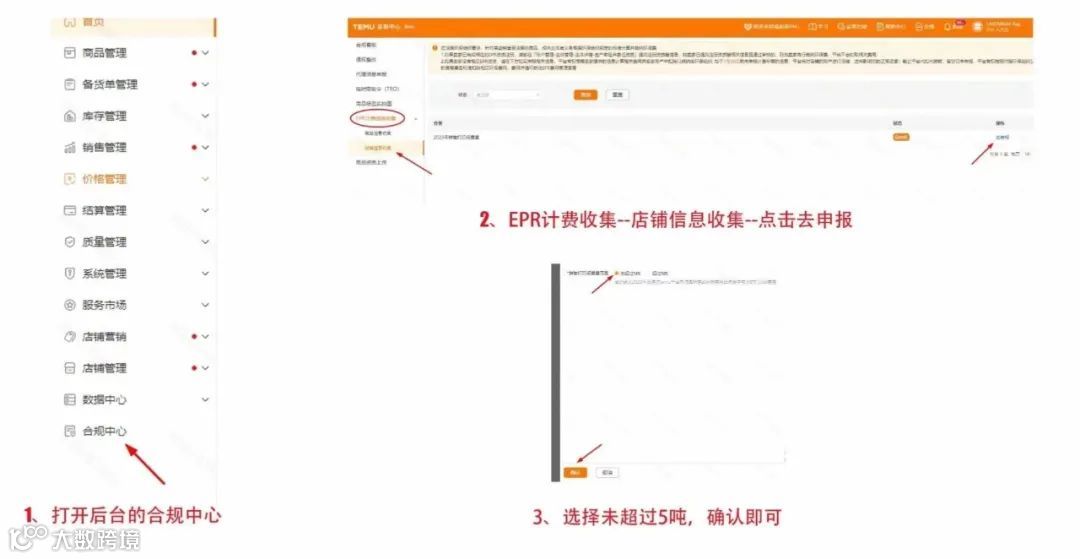 到TEMU后台的卖家中心→合规中心,找到EPR计费信息收集→店铺信息收集,按页面的提示去操作即可。