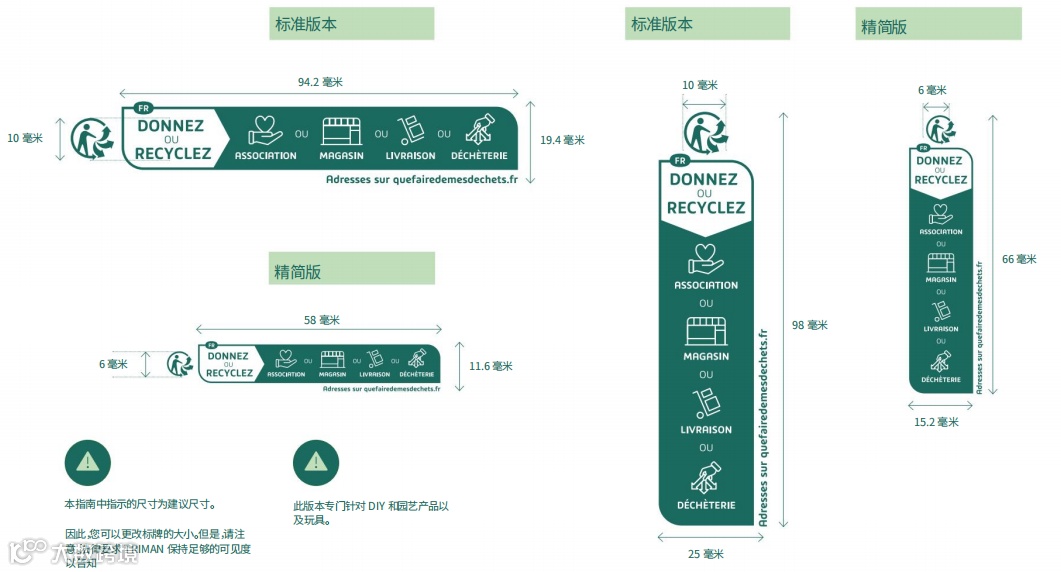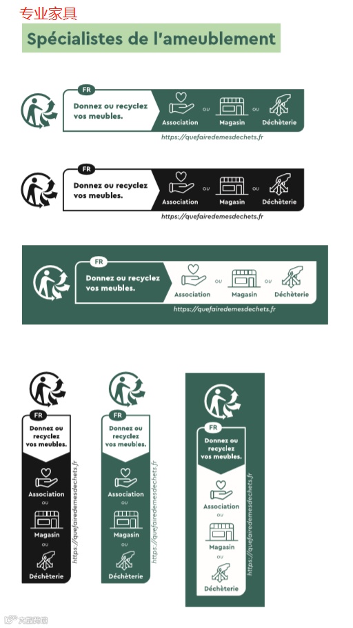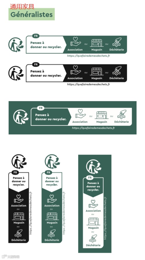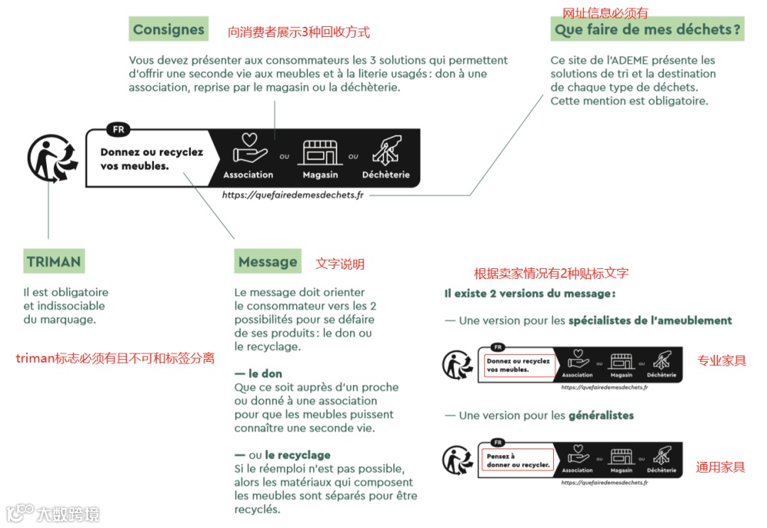 法国家具印刷标志由4部分组成:① Triman标志+②文字说明+③三种回收方式+④网址信息;