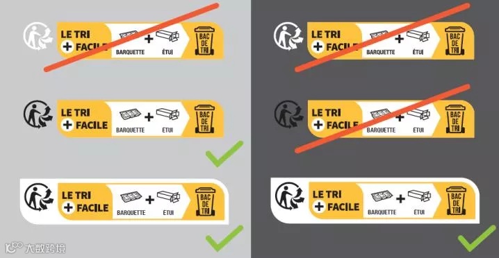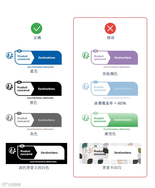 ②Triman标志和回收说明不建议用贴纸贴在包装上。贴纸易脱落,一旦掉落会被认为包装不合规,将会面临相应的法律处罚。