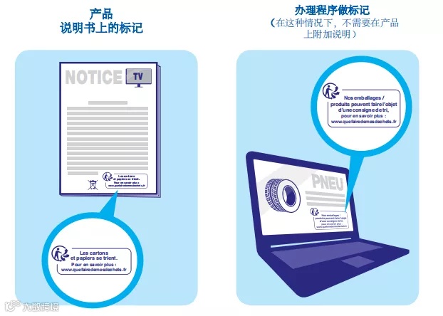 如果产品本身、包装上都印刷不了,Triman标志可印在产品说明书上,并且要加上产品分类和扔进垃圾桶的文字/图案说明。