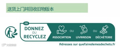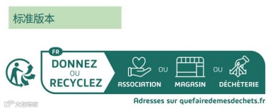 表明【可回收】;比如单个产品,那就说明此产品可回收:Cet apparell se recycle;如果单个产品带附件,则对应说明产品和附件可回收: Cet apparell et ses accessoires se recycle;